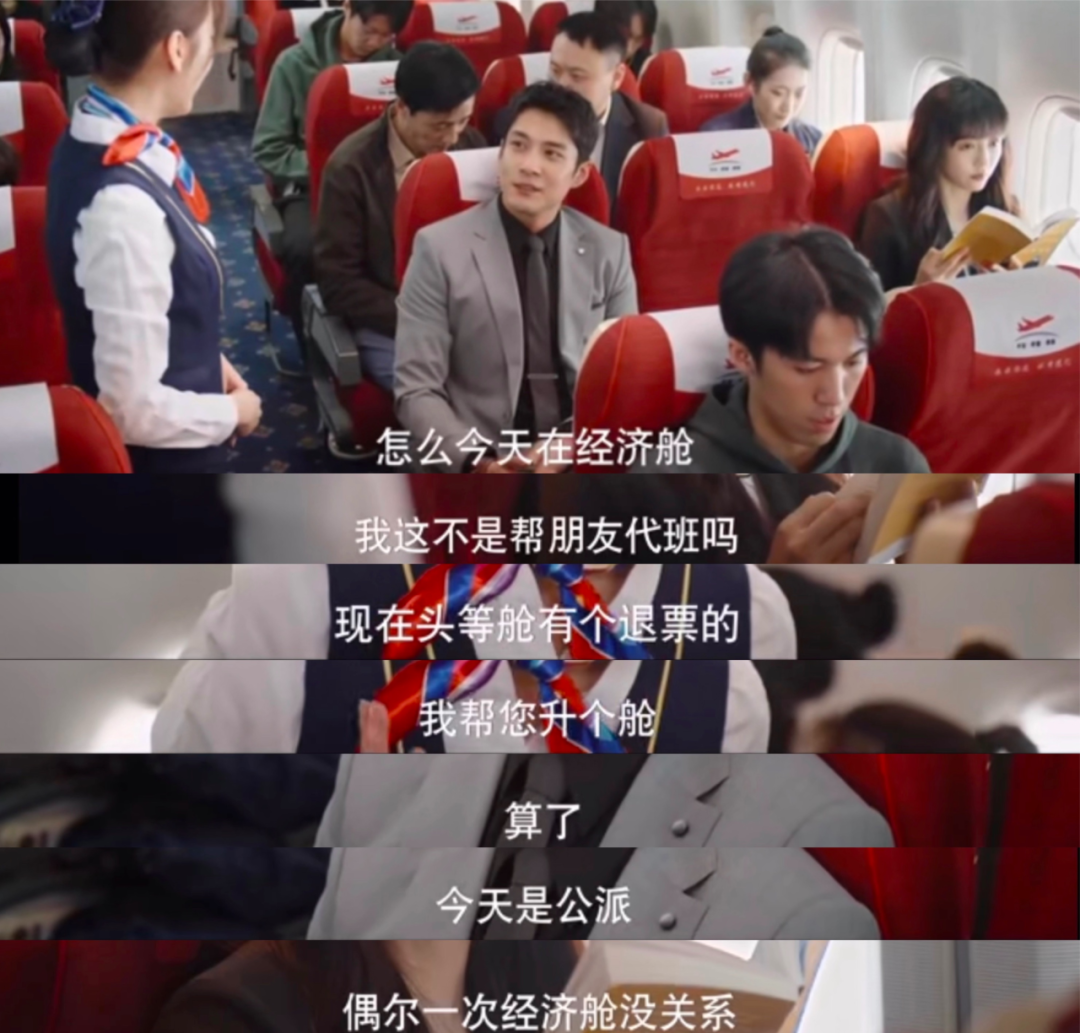 先是跟空姐谈笑风生,彰显自己是常年飞来飞去的高级旅客;等空姐主动提出帮他升舱,他又低调拒绝,展现自己的绅士风度。