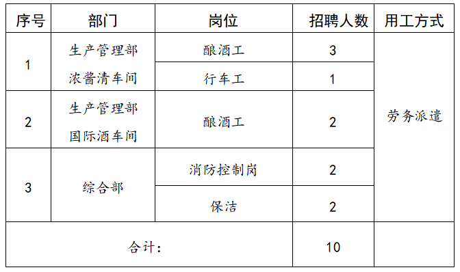 四川经纬九曲河酒业有限公司是四川经纬教育管理集团有限公司下属全资控股子公司,公司经营范围主要有酒制品生产、酒类经营、食品生产、食品销售、餐饮服务、住宿服务等。现因工作需要,公司计划长期招聘一批一线工作人员,详细内容如下: